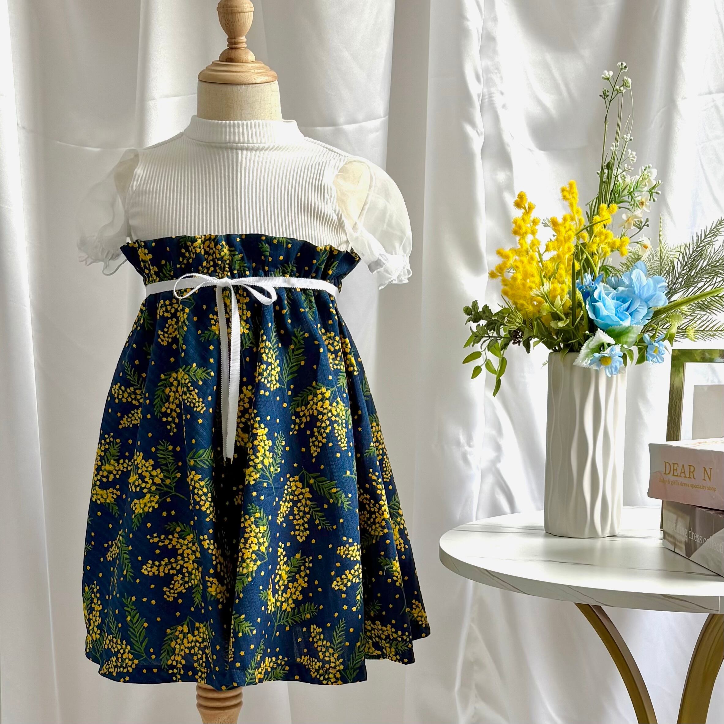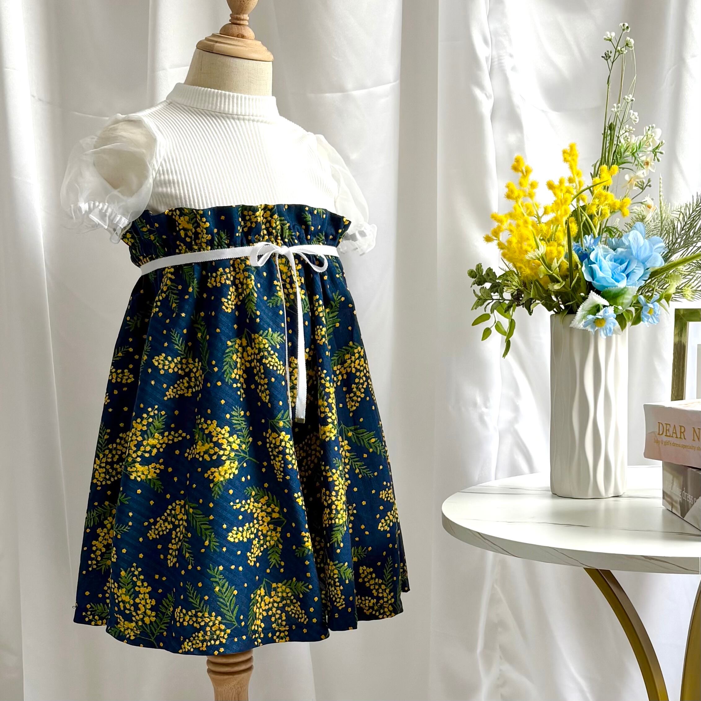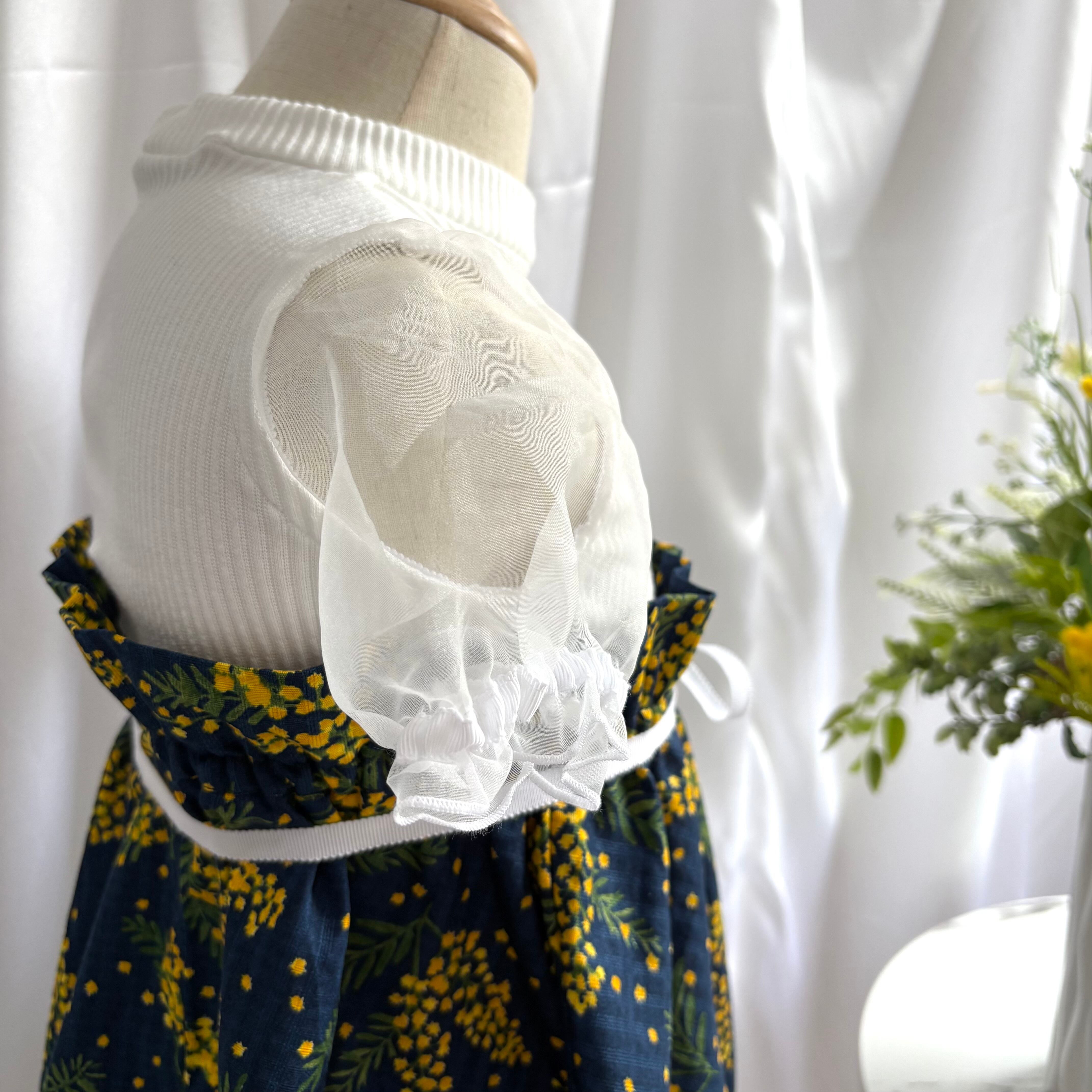 ミモザのかわいらしい雰囲気を活かしつつ、まるでブーケのような上品なワンピースに仕上げました。